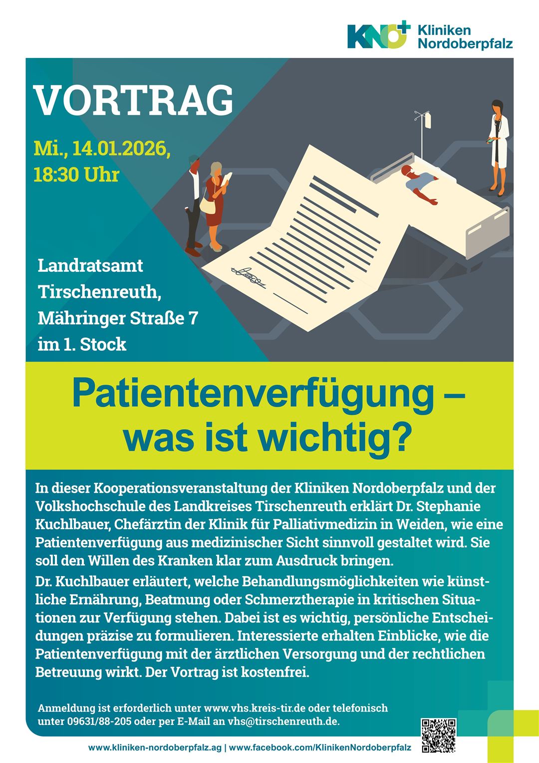 Im Vortrag „Patientenverfügung – was ist wichtig?“ erklärt Dr. Stephanie Kuchlbauer, Chefärztin der Klinik für Palliativmedizin an den Kliniken Nordoberpfalz, wie eine Patientenverfügung aus medizinischer Sicht sinnvoll gestaltet wird. Sie soll den Willen des Kranken in schwierigen Situationen klar zum Ausdruck bringen. Dr. Kuchlbauer erläutert detailliert, welche Behandlungsmöglichkeiten in kritischen Situationen wie künstliche Ernährung, Beatmung oder Schmerztherapie zur Verfügung stehen. Dabei ist es wichtig, persönliche Entscheidungen präzise formulieren zu können. Interessierte erhalten Einblicke, wie die Patientenverfügung im Zusammenspiel mit der ärztlichen Versorgung und der rechtlichen Betreuung wirkt, um sicherzustellen, dass medizinische Wünsche auch im Ernstfall respektiert werden. Der Vortrag richtet sich an alle, die eine fundierte und medizinisch abgestimmte Patientenverfügung erstellen möchten.